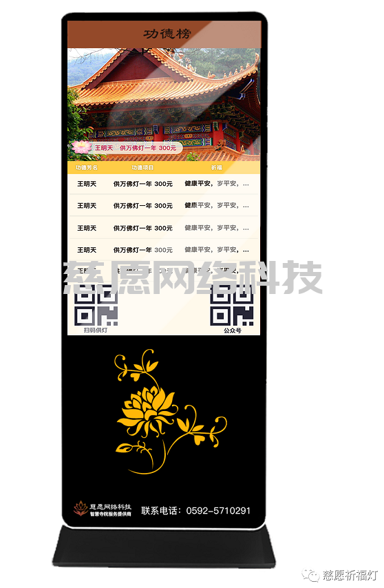 寺院捐贈系統(tǒng)中的供燈祈福模塊讓信眾通過微信公眾號、APP或觸摸屏、現(xiàn)場掃碼線上線下按天、按月、按年付費(fèi)供燈,直播查看祈福信息。